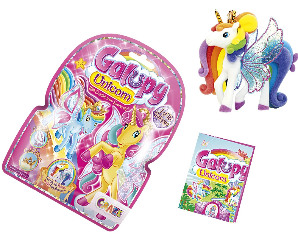 Galupy – Skrzydlate Jednorożce to kolekcja flokowanych jednorożców w saszetce. Figurki jednorożców Galupy są absolutnie unikalne, każda z nich wyróżnia się swoim wyjątkowym charakterem, a niektóre posiadają nawet niezwykłe magiczne moce. Każdy detal Galupa został starannie wykonany, a całość utrzymana jest w niezwykle fantastycznej, baśniowej stylistyce. Ich skrzydełka są ozdobione połyskującą warstwą, imitującą efekt brokatu, co sprawia, że prezentują się niezwykle efektownie. Dodatkowo skrzydełka zachwycają subtelnym efektem złota, co dodaje im dodatkowego uroku. Jednym z najbardziej niezwykłych jednorożców jest Lilly, który dumnie nosi na swojej koronie kryształ Swarovskiego. W każdej saszetce oprócz jednorożca znajduje się ulotka z bajkową grafiką i historią Galupów. Galupy – Skrzydlate Jednorożce to idealny prezent dla wszystkich – małych i dużych dziewczynek, które kochają fantastyczny świat magii i jednorożców. W asortymencie: 18 jednorożców, a wśród nich jeden unikalny, ozdobiony kryształem Swarovskiego. Zawartość opakowania: – 1 skrzydlaty jednorożec Galupy, – 1 broszura. Wymiary display (ilość sztuk: 24): 20×16,5x32cm Wymiary 1 szt.: 14x17x3,5cm Wiek: 3+