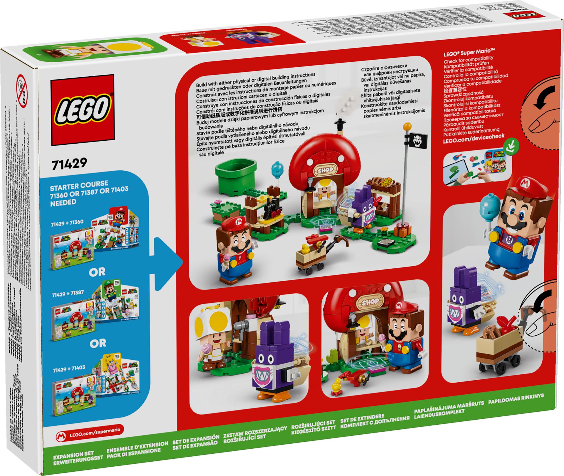 odczas zabawy tym kolekcjonerskim zestawem rozszerzającym LEGO® Super Mario™ (71429) złożysz wizytę Toadowi w jego sklepie. To świetny pomysł na prezent dla fanów Super Mario™ w wieku od siedmiu lat. Zestaw zawiera dwie postaci Super Mario do zbudowania – Żółtego Toada i Nabbita – a także sklep z rozmaitymi akcesoriami spożywczymi i wózkiem zakupowym. Interaktywną zabawę zapewnią figurki LEGO® Mario™, LEGO® Luigi™ lub LEGO® Peach™ z zestawów startowych (71360, 71387 lub 71403 – każdy sprzedawany osobno). Interaktywne figurki mogą skakać na znacznik akcji, aby powitać Żółtego Toada, kupić cyfrowe artykuły spożywcze, takie jak lody, owoce i ciastka, a także wskoczyć na torbę Nabbita i zdobyć inne cyfrowe elementy. W aplikacji LEGO Super Mario znajdziesz instrukcje budowania tego zestawu. Aplikacja oferuje też inspiracje dotyczące pomysłów na budowanie oraz zabawę, a także bezpieczne forum, na którym dzieci mogą dzielić się modelami.—• Zestaw z Żółtym Toadem i Nabbitem – baw się w wizytę w sklepie Toada dzięki temu zestawowi rozszerzającemu LEGO® Super Mario™ ze sklepem do zbudowania i wieloma akcesoriami• Zawiera dwie postacie Super Mario™ – figurki Żółtego Toada i Nabbita mogą chwytać akcesoria w ręce. Nabbit ma także torbę do zbudowania• Kolekcjonerska zabawka pełna detali – sklep zawiera maszynę do lodów z klocków i piec, stoisko z różnymi zabawkami i akcesoriami spożywczymi oraz wózek zakupowy• Interaktywna zabawa – skocz na znacznik akcji figurką LEGO® Mario™, LEGO® Luigi™ lub LEGO® Peach™ (nie są częścią zestawu), aby „zjeść” produkty, lub skocz na torbę Nabbita, aby zdobyć różne cyfrowe elementy• Prezent dla siedmiolatków i starszych graczy – podaruj ten 230-elementowy zestaw jako prezent fanom gry Super Mario™; do interaktywnej zabawy wymagany jest zestaw startowy LEGO® Super Mario™ (71360, 71387 lub 71403)• Pomoc w budowaniu – aplikacja LEGO® Super Mario™ zawiera instrukcje budowania, kreatywne materiały inspirujące i nie tylko. Listę zgodnych urządzeń z systemem Android i iOS znajdziesz na stronie LEGO.pl/devicecheck• Pobudź dziecięcą kreatywność – zestawy LEGO® Super Mario™ do zabawy w pojedynkę i w grupie oferują interaktywną zabawę w zbieraniemonet i kreatywne wyzwania, a także pozwalają rozbudowywać i przekształcać poziomy• Sklep do zbudowania z klocków – sklep Toada ma 16 cm wysokości, 23 cm szerokości i 12 cm głębokości i można go dodać do innych zestawów LEGO® Super Mario™