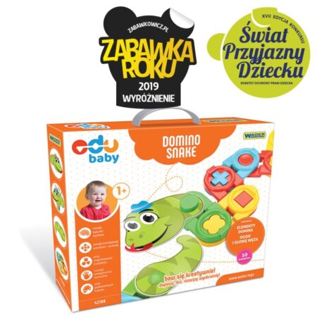 Domino Snake składa się z 10 elementów: 8 elementów domina z tworzywa sztucznego oraz kartonowej głowy i ogona węża. Zadaniem dziecka jest połączenie różnych elementów domina w taki sposób, aby powstała pani lub pan wąż. Dwustronna głowa i ogon węża wykonane zostały z grubej tektury puzzlowej z otworami do połączenia z dominem. Poręczne opakowanie z rączką, wielokrotnego użytku, spełnia również funkcję teczki do przechowywania zabawki oraz prac plastycznych dziecka.